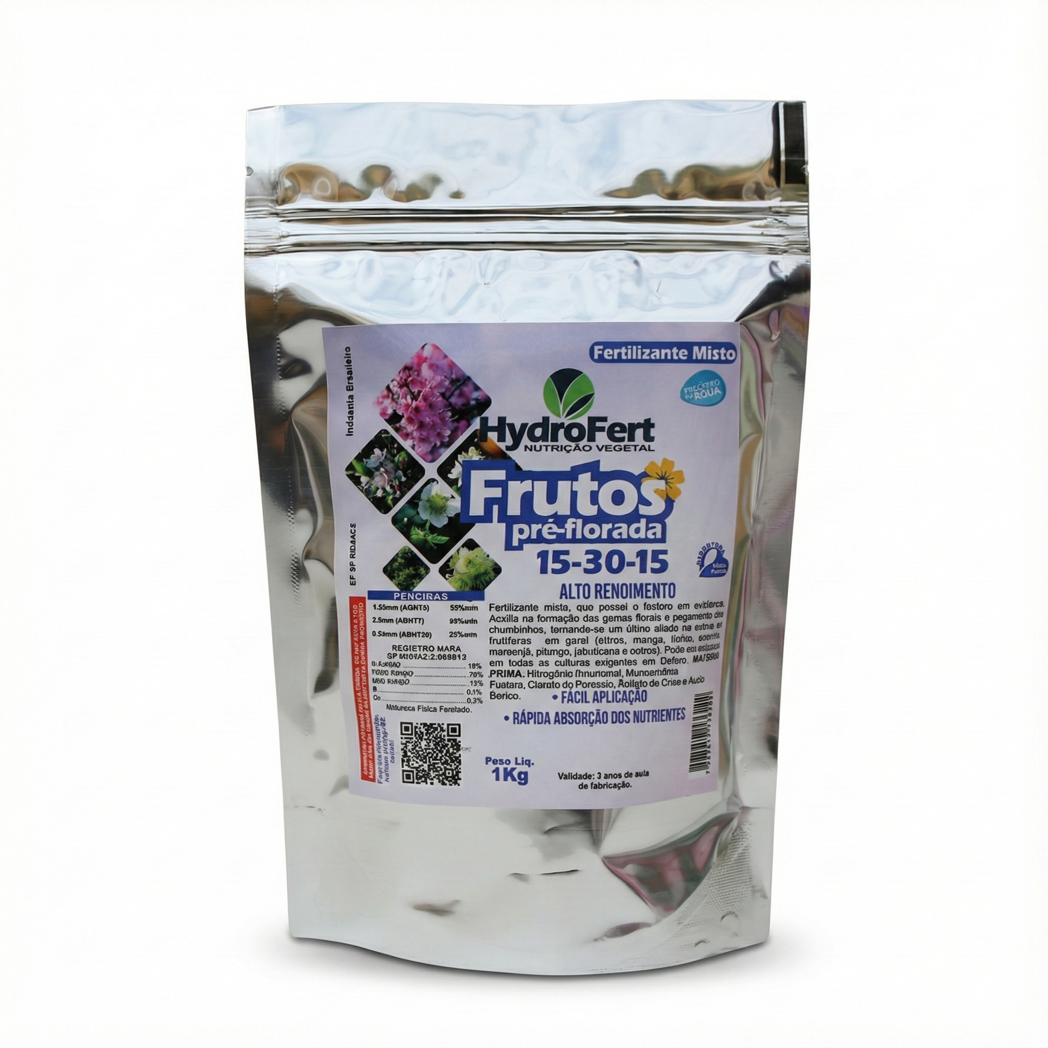 HydroFert Frutos Pré-Florada é um fertilizante mineral misto especialmente formulado para estimular a formação das gemas florais, melhorar o pegamento dos botões e favorecer o desenvolvimento dos chumbinhos. Com fósforo elevado, é um aliado essencial para culturas frutíferas exigentes nessa fase de crescimento.